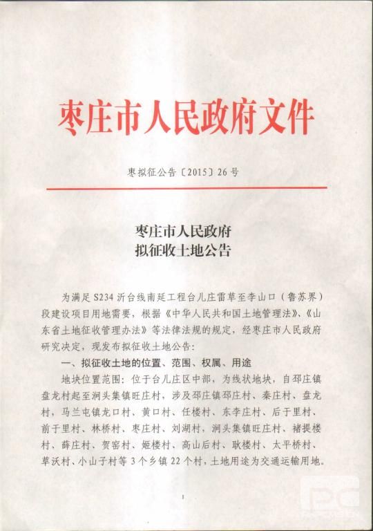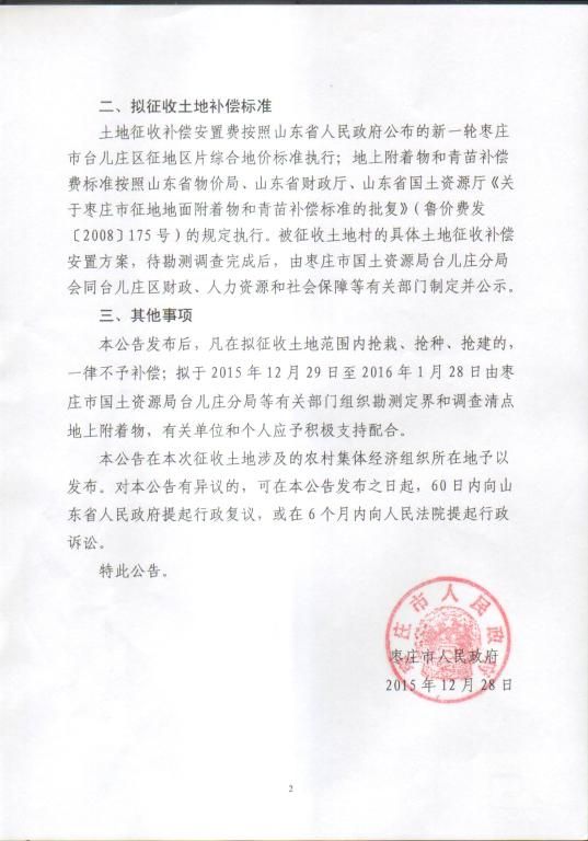 枣庄市人民政府拟征收土地公告